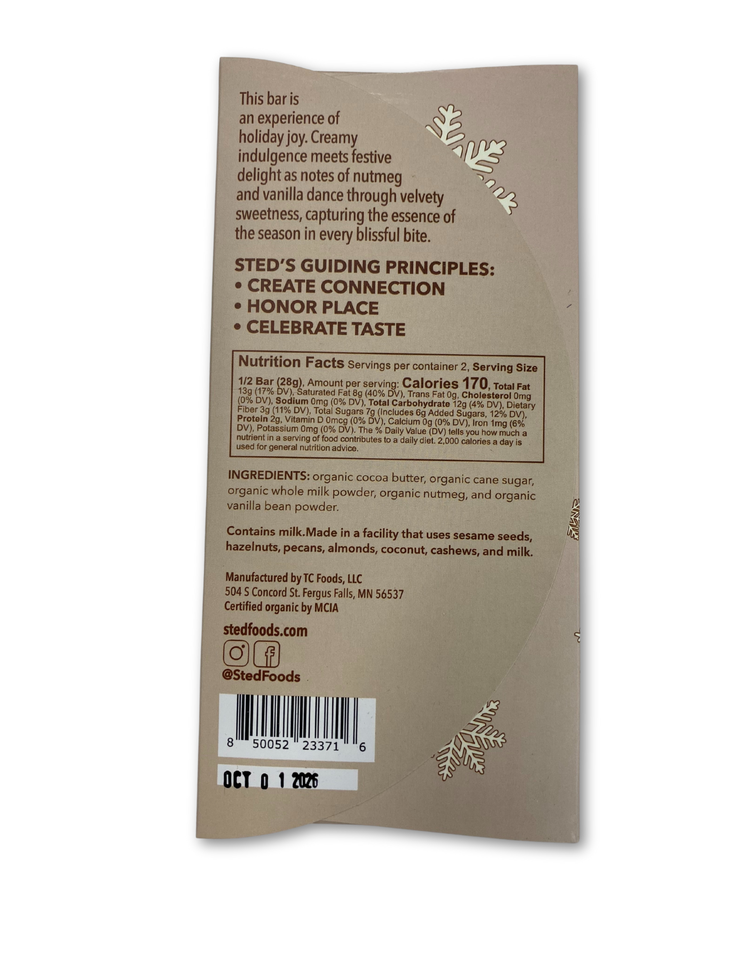 This bar is an experience of holiday joy. Creamy indulgence meets festive delight as notes of nutmeg and vanilla dance through velvety sweetness, capturing the essence of the season in every blissful bite. This is a limited-edition, seasonal bar, while they last!