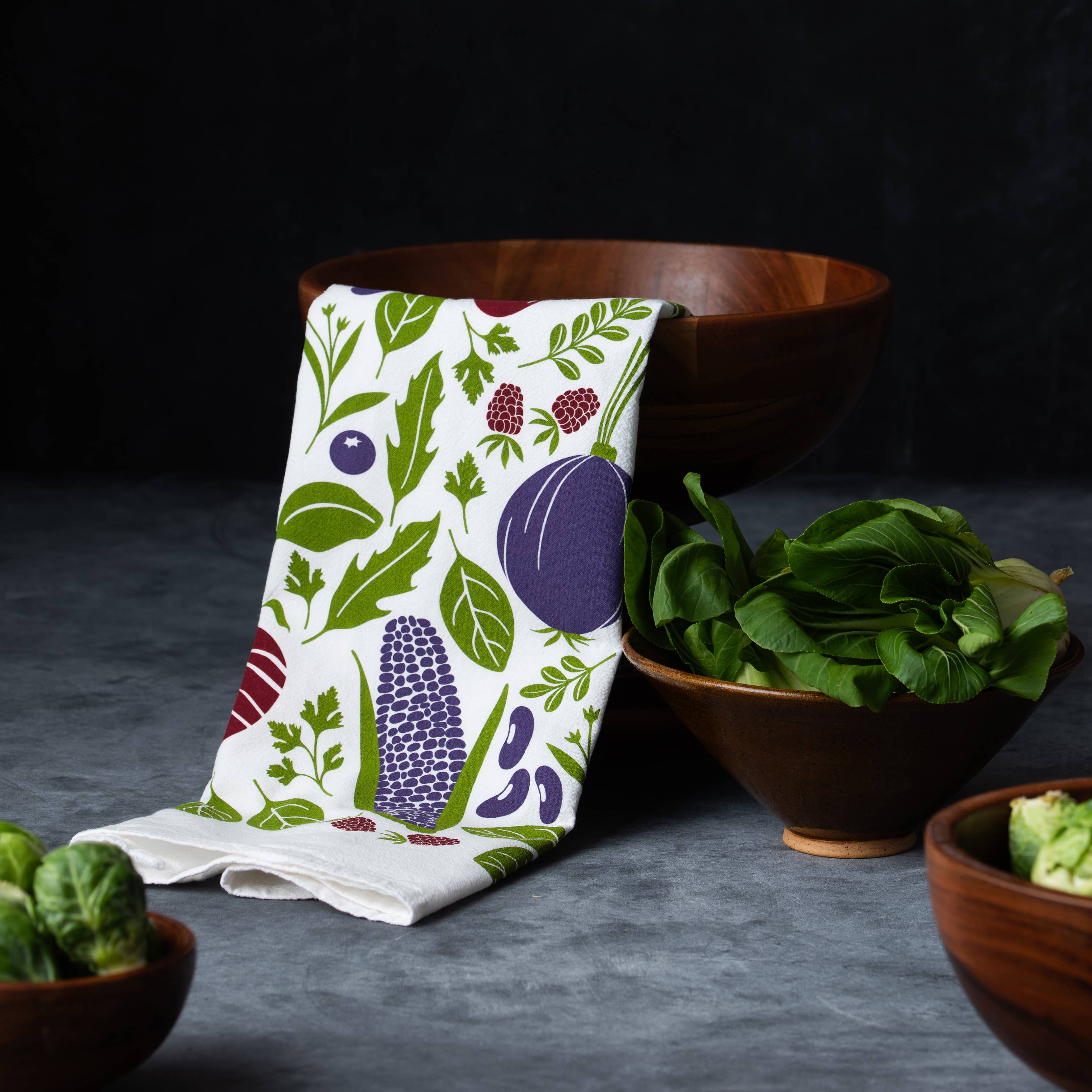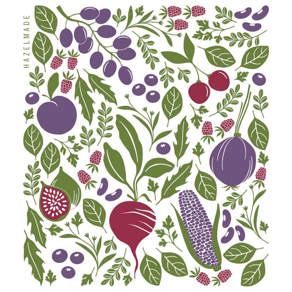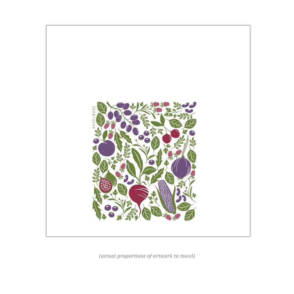 The perfect purple vibes dish towel for your kitchen. Highlighting farmers market veg, these absorbent cotton towels feature original artwork by our friend, Susan Hazel Rich, of Hazelmade. Long lasting and truly effective this towel combines beauty + function and keeps your kitchen fresh.