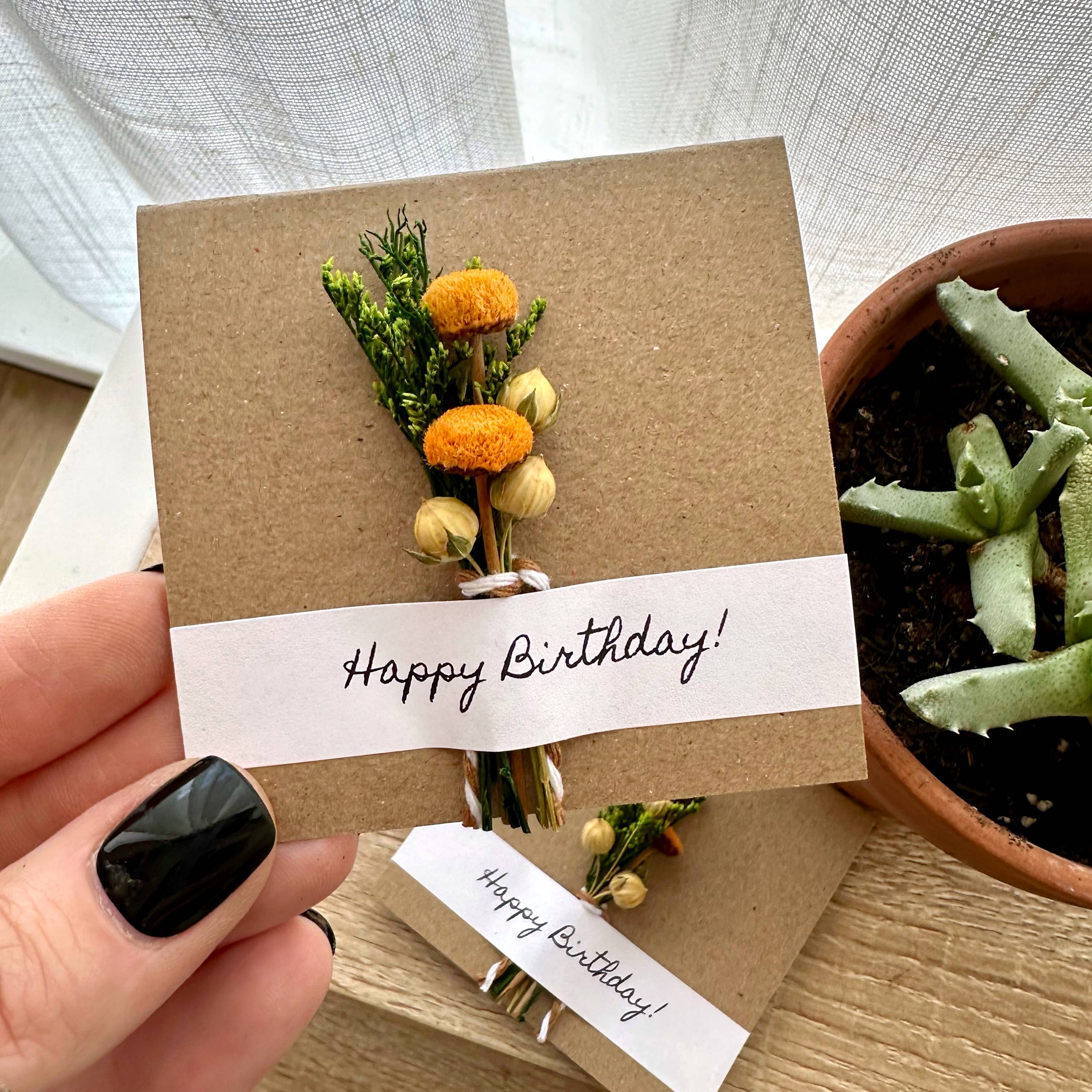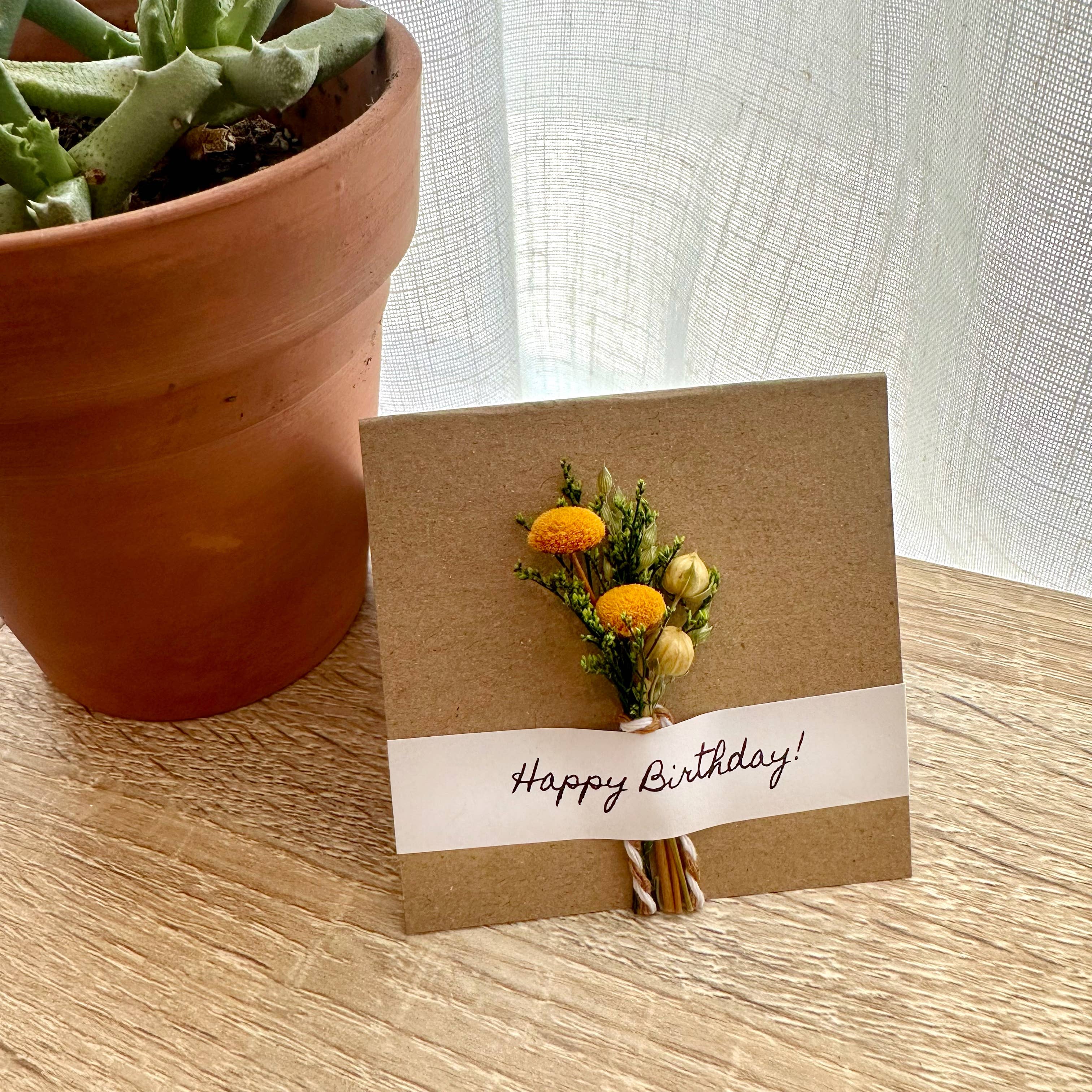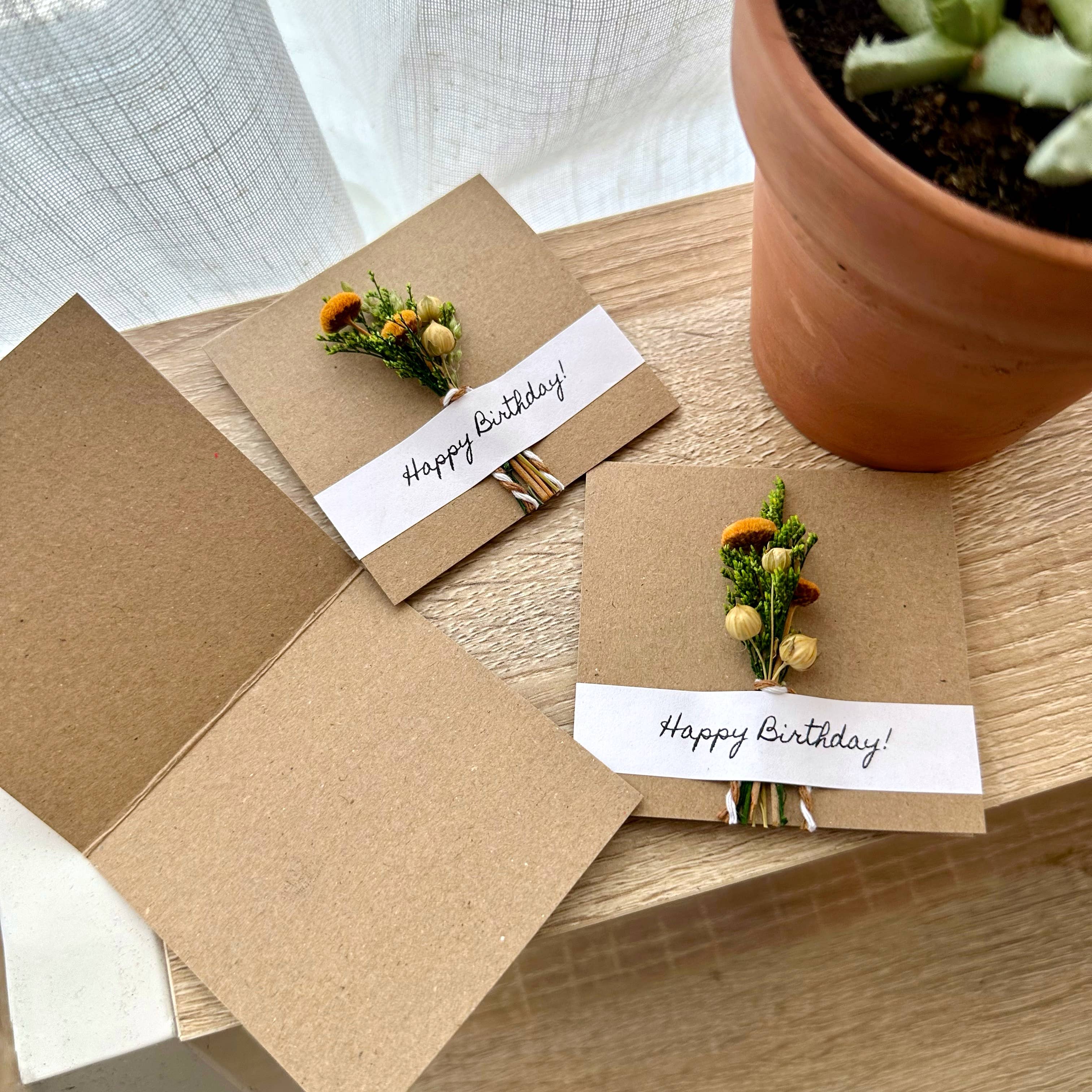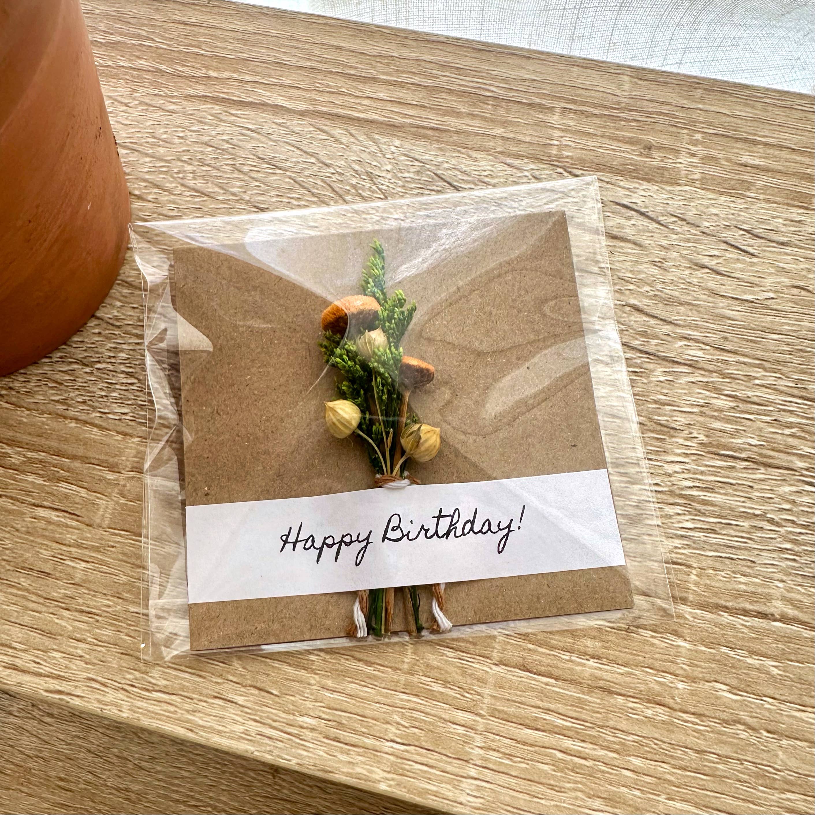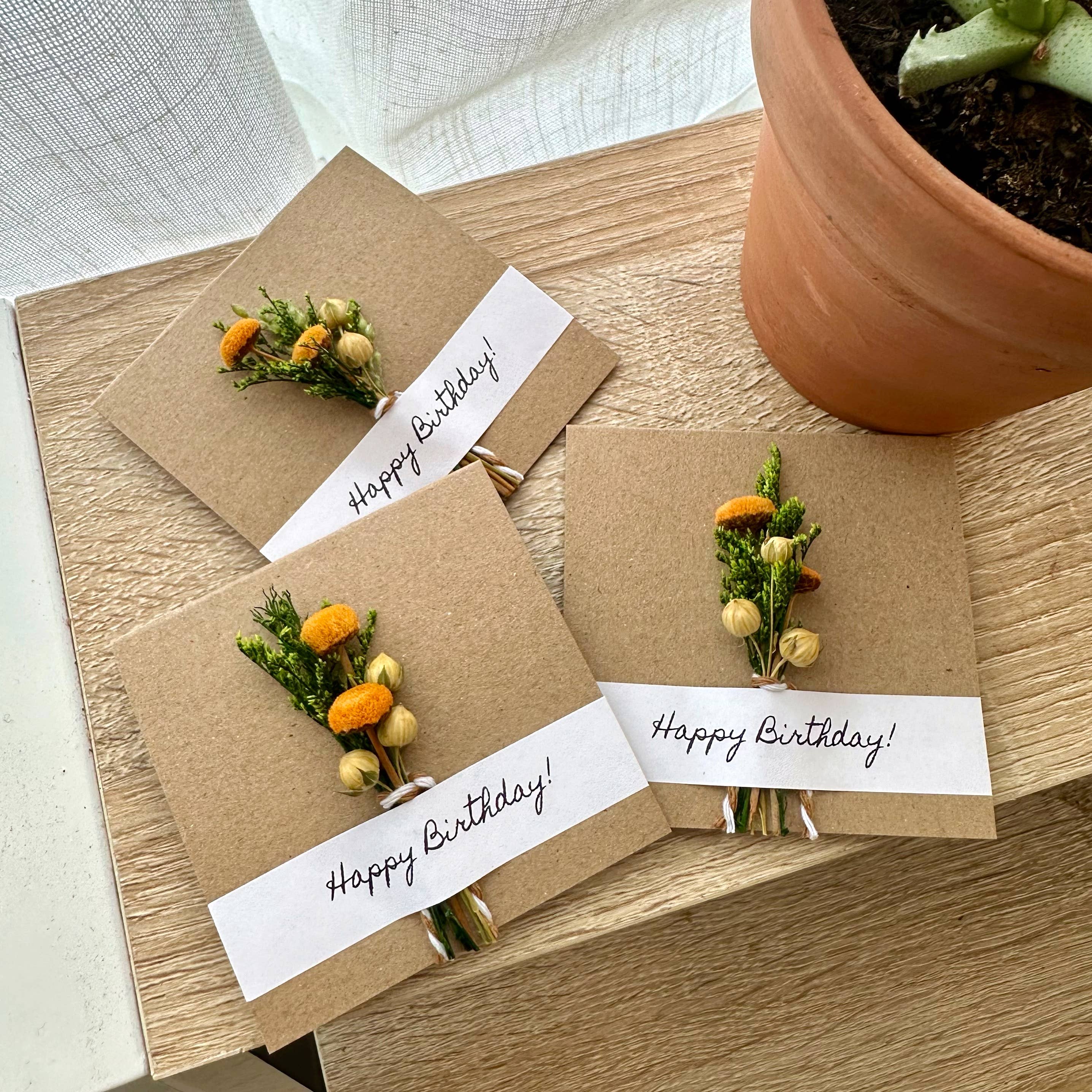 We love these Happy Birthday bouquet cards with mini dried flowers attached. These cards are perfect to give as a standalone gift or as an addition to a gift.