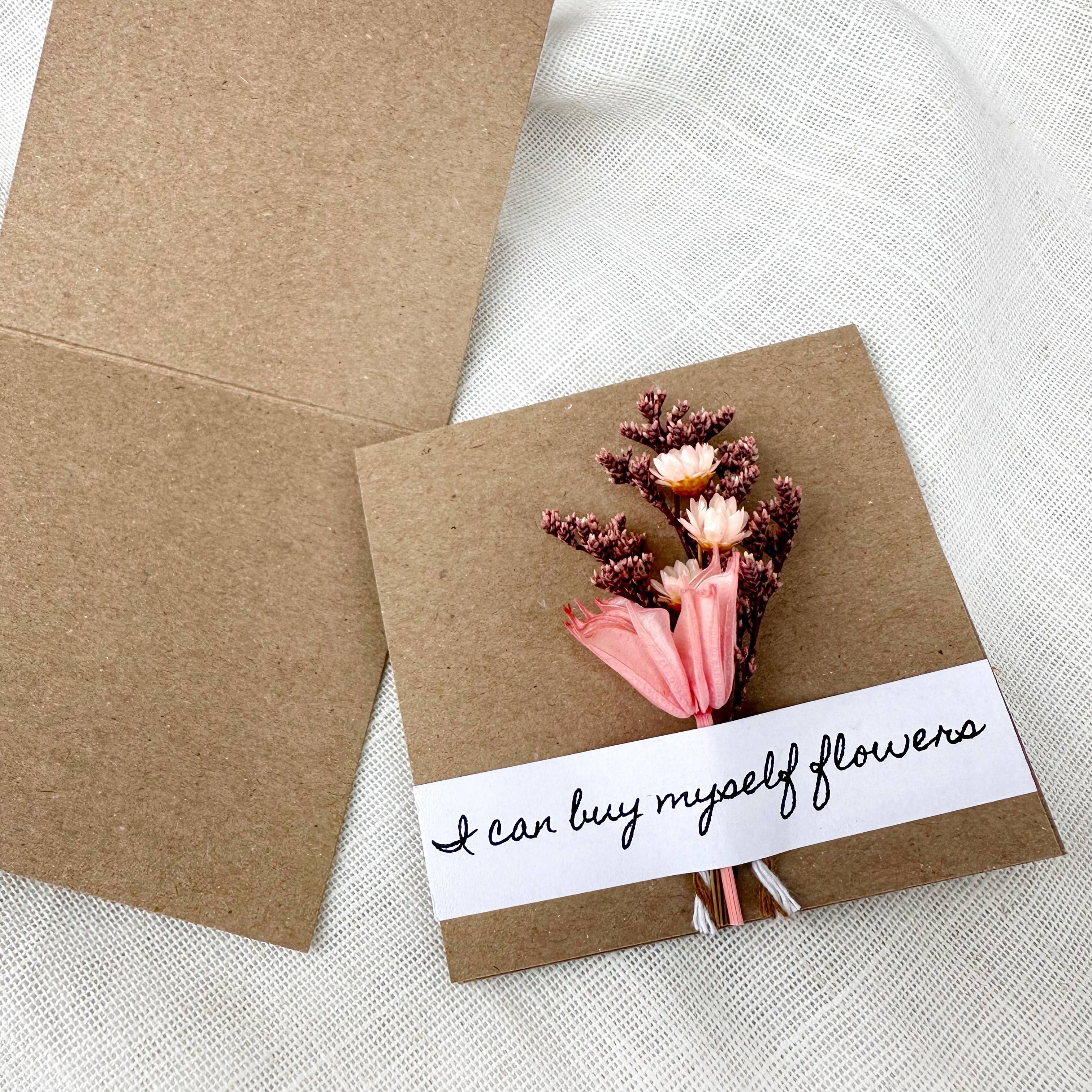 Each card has a beautifully preserved dried floral bouquet attached to a kraft texture paper bifold card. These cards are perfect to give as a standalone gift or as an addition to a gift.