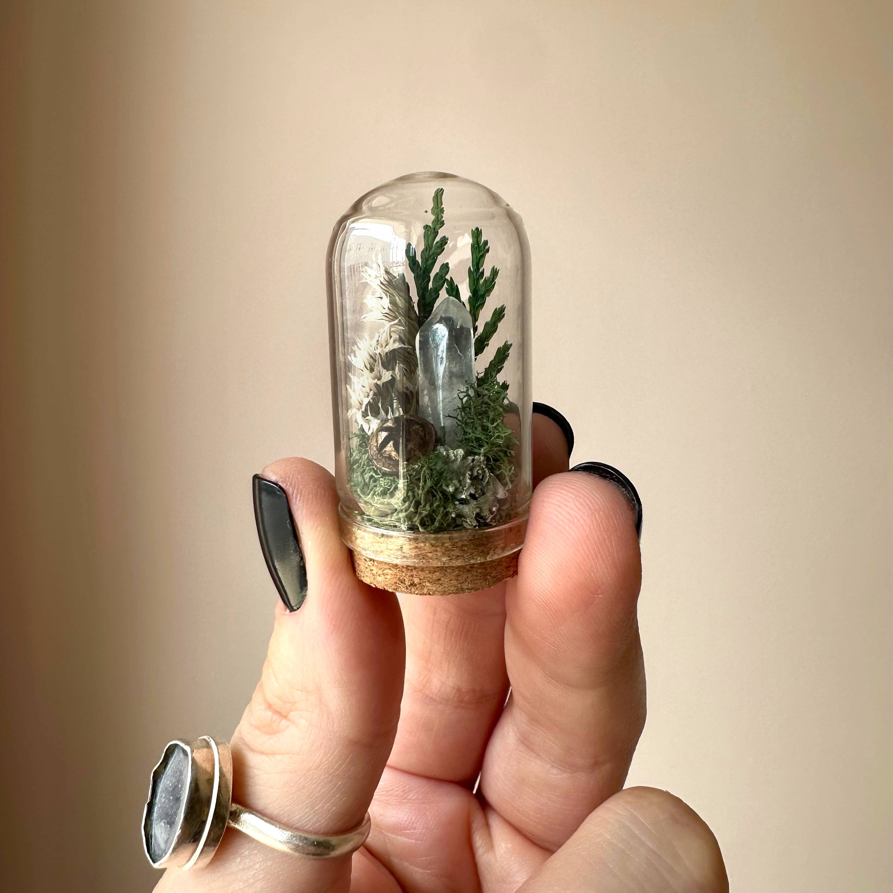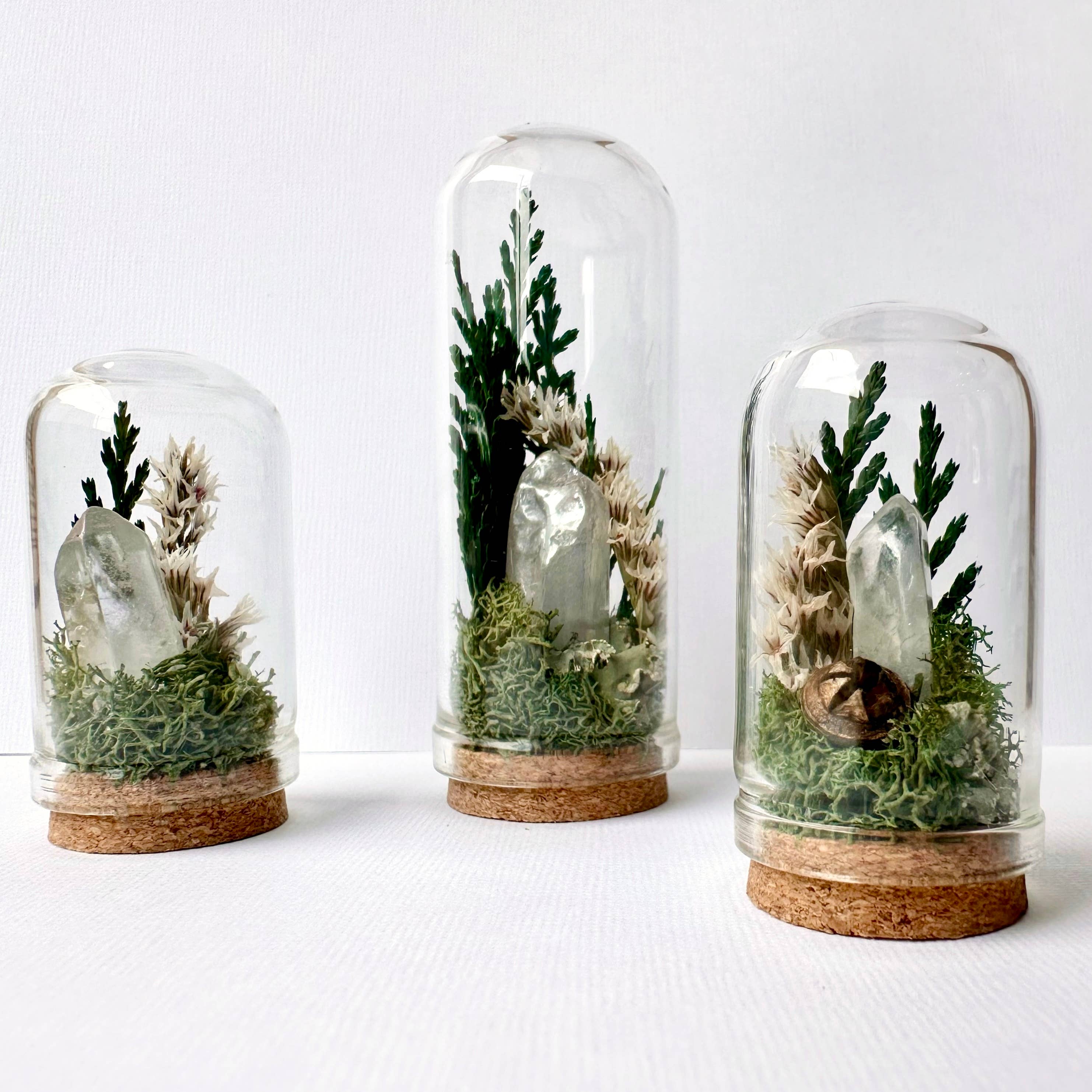 Moonlight Crystal Terrarium Glass terrariums made with real dried florals and mosses! These are the perfect desk decor or highlight for your nightstand or windowsill. This wee little terrarium includes crystal, moss, greens and magic.